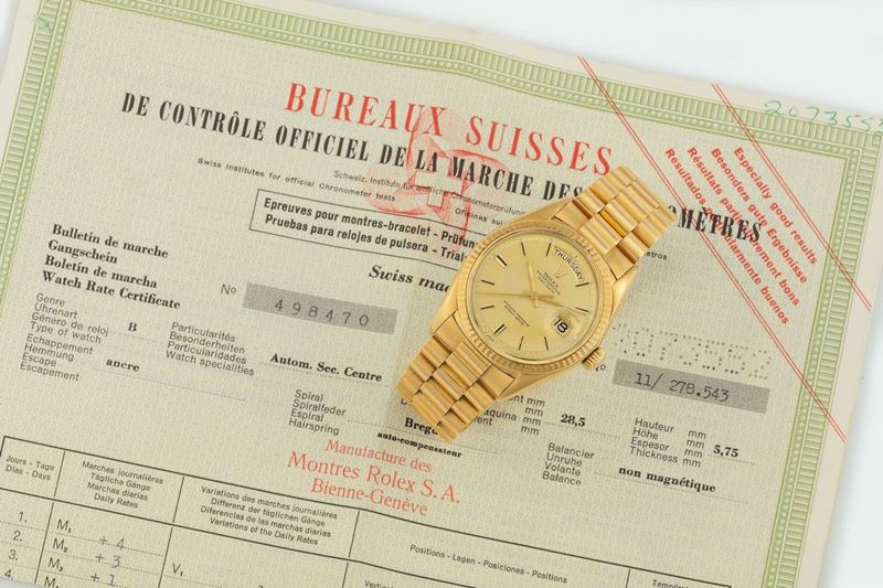 ROLEX, Oyster Perpetual Day-Date, Superlative Chronometer officially Certified, cassa No. 2073552, Ref.1803, orologio da polso, in oro giallo 18K, automatico, con datario/giorno della settimana e bracciale in oro Rolex President con chiusura deployante. Accompagnato dal Certificato di Cronometria originale, istruzioni e libretti. Realizzato circa nel 1969
