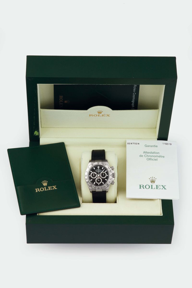 ROLEX, Oyster Perpetual, Superlative Chronometer, Officially Certified, Cosmograph Daytona, cassa No. Z247524, Ref. 116519. Orologio da polso, in oro bianco 18K, cronografo, impermeabile, automatico con chiusura deployante in oro. Accompagnato dalla Garanzia originale e scatola. Venduto nel 2007