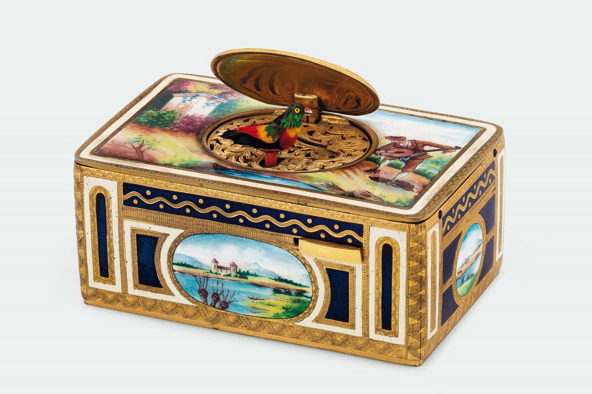 Scatola musicale in ottone dorato e smalti con automa. Realizzata nel 1900 circa