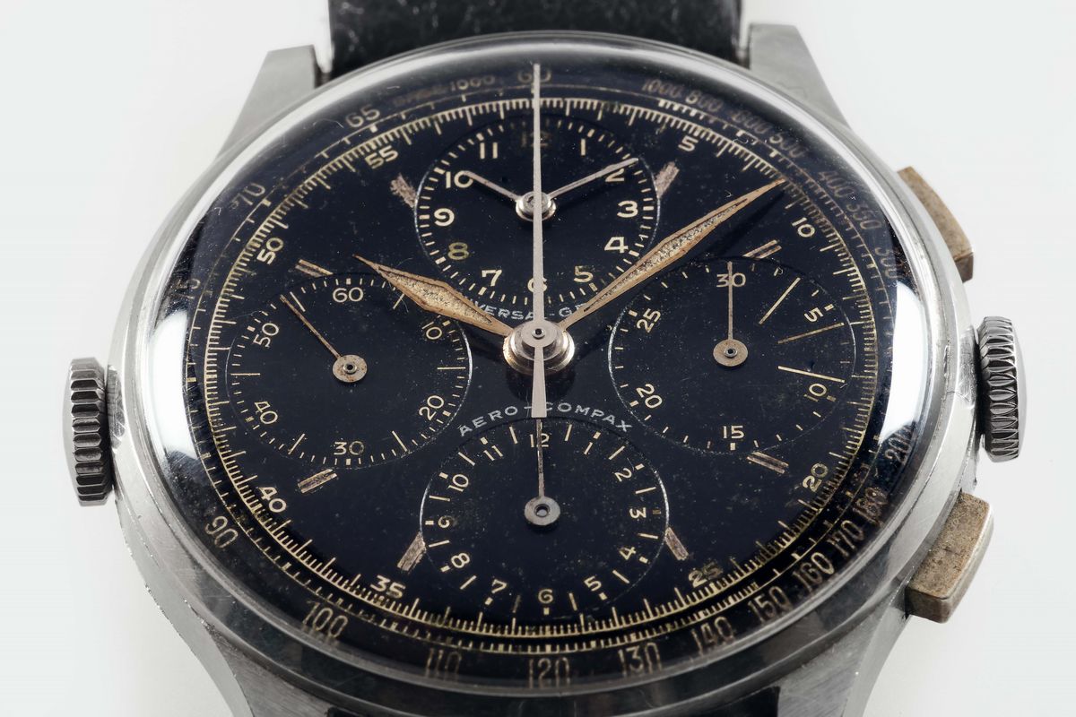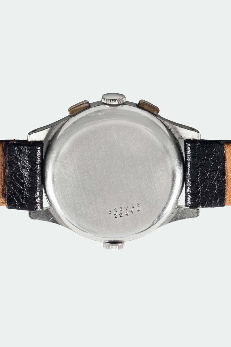 UNIVERSAL GENEVE, Aéro-Compax, cassa No. 826226, Ref. 22414. Raro orologio da polso, in acciaio, cronografo con scala tachimetrica e quadrante ausiliare memento. Realizzato nel 1941 circa