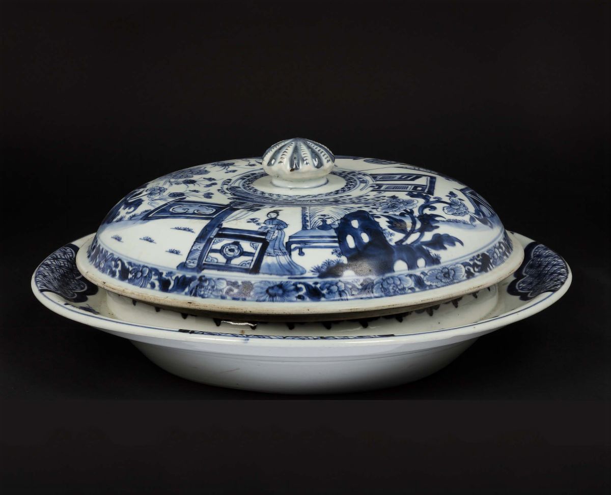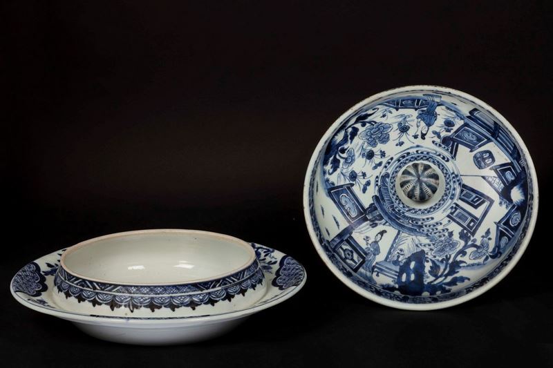 Ciotola in porcellana bianca e blu con coperchio e raffigurazioni di scene di vita quotidiana, Cina, Dinastia Qing, epoca Kangxi (1662-1722) e Qianlong (1736-1796)