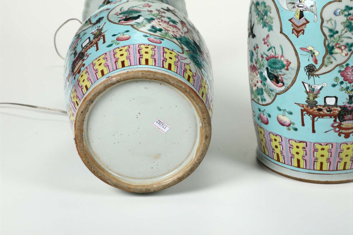 Coppia di vasi in porcellana Famiglia Rosa con raffigurazioni naturalistiche entro riserve su fondo turchese, Cina, Dinastia [..]
