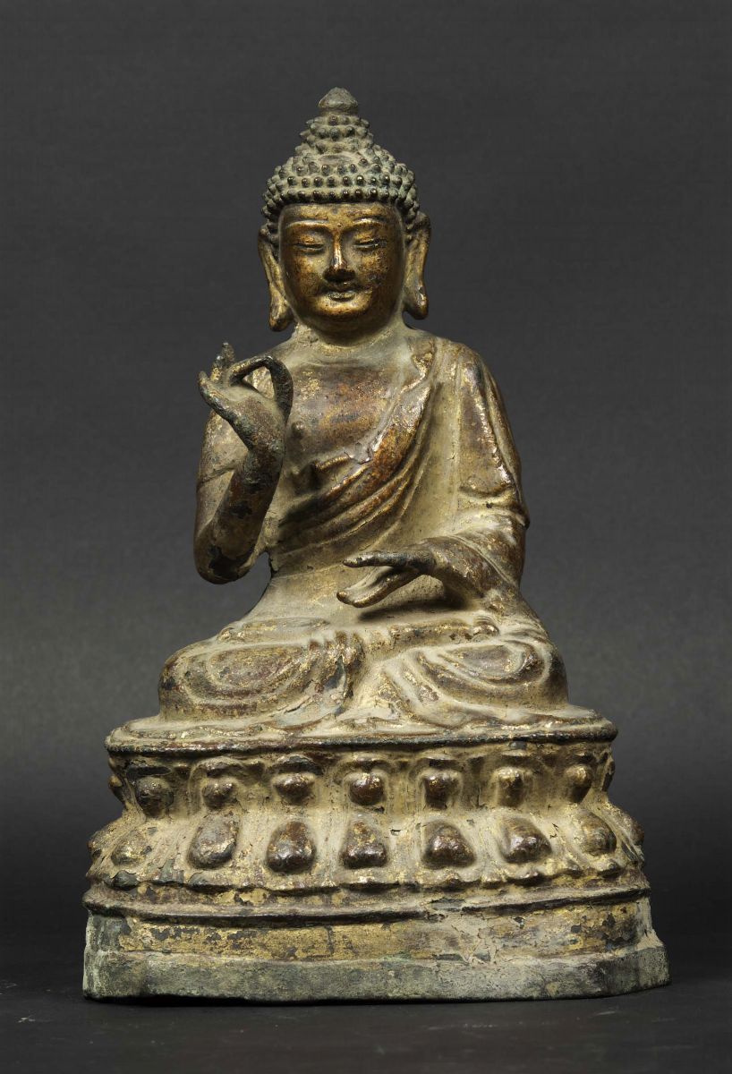 Figura di Buddha Sakyamuni in bronzo con tracce di doratura seduto su doppio fiore di loto, Cina, Dinastia Ming, XVI-XVII [..]