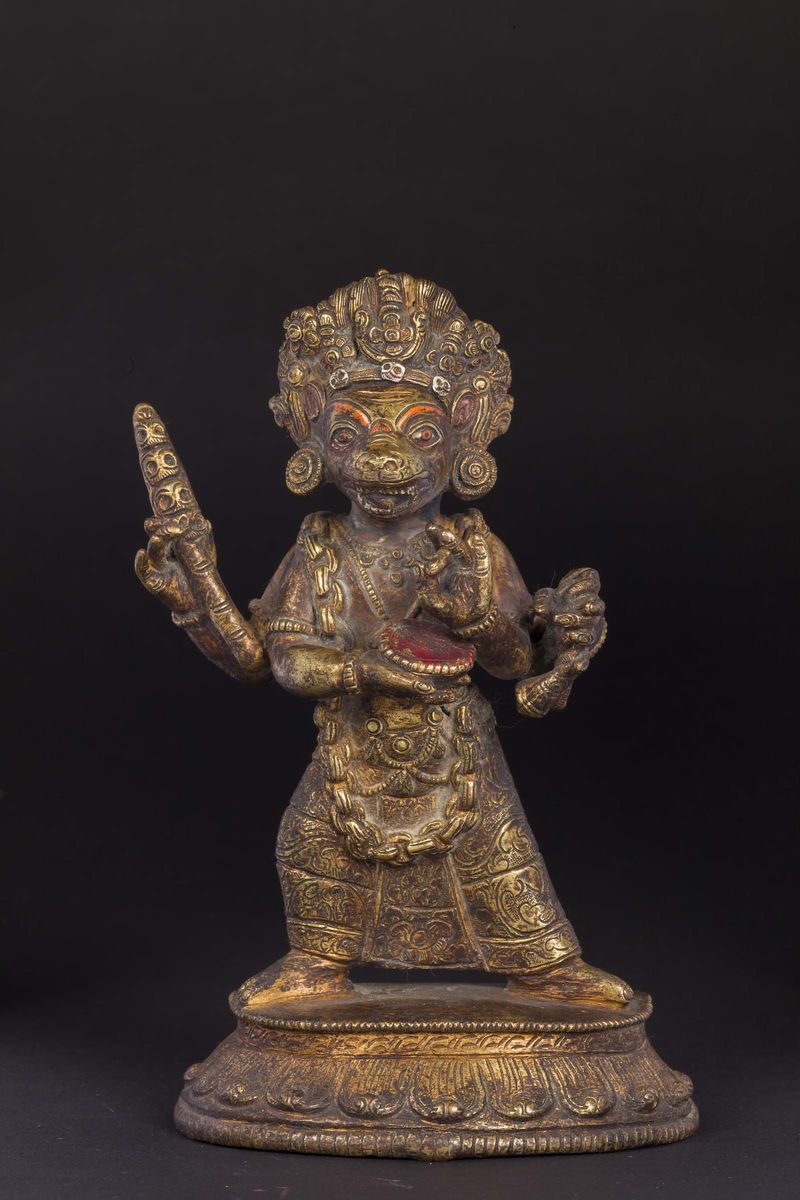 Figura di Mahakala in bronzo dorato eretto, Tibet, XVIII secolo