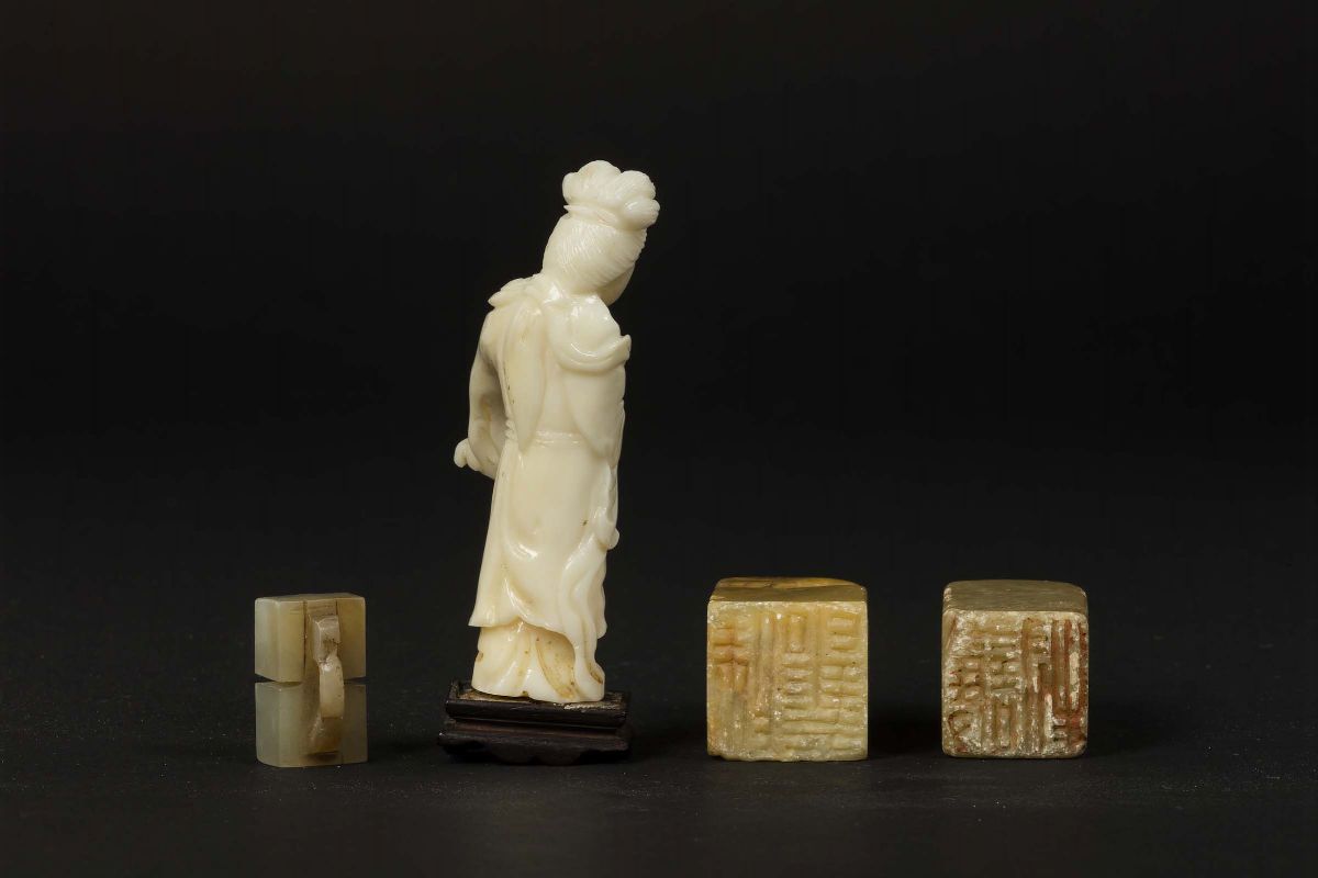 Lotto composto da due sigilli in saponaria, una piccola Guanyin in corallo bianco e una fibbia in giada bianca e russet, Cina, Dinastia Qing, XIX-XX secolo