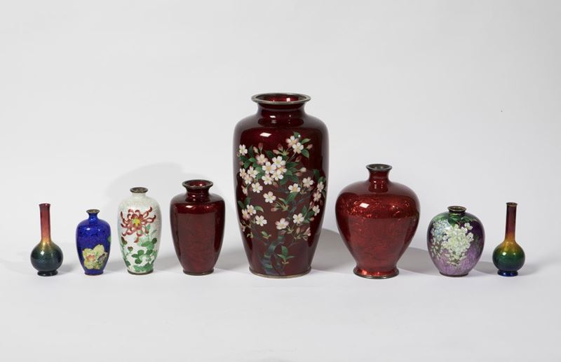 Lotto composto da otto vasi di forme e dimensioni diverse in argento smaltato, Giappone, inizi XX secolo