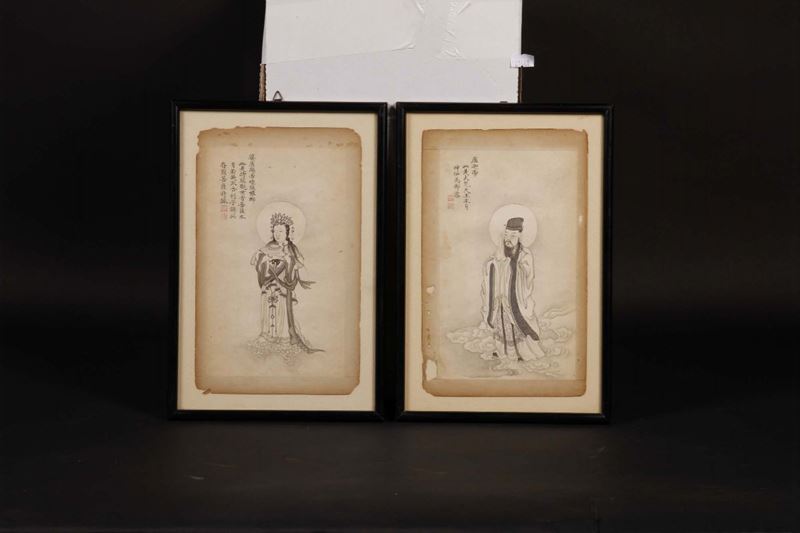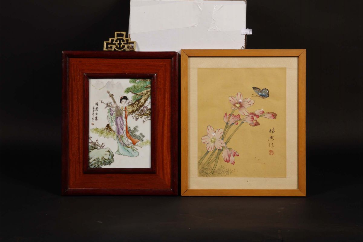 Lotto composto da: placca in porcellana con paesaggio con iscrizione, placca in porcellana con Guanyin con iscrizione, due disegni a carboncino raffiguranti saggio e divinità con iscrizione, dipinto su seta raffiguranti fiori e farfalla con iscrizioni, dipinto su seta raffigurante ramo di fiori con uccellino e sigillo, disegno raffigurante drago con iscrizioni e sigillo, dipinto su seta raffigurante fiori e libellula con sigillo, coppia di dipinti su seta (rovinati) con fiori ed iscrizioni, dipinto su carta raffigurante fiore con iscrizione, Cina, dal XIX al XX secolo