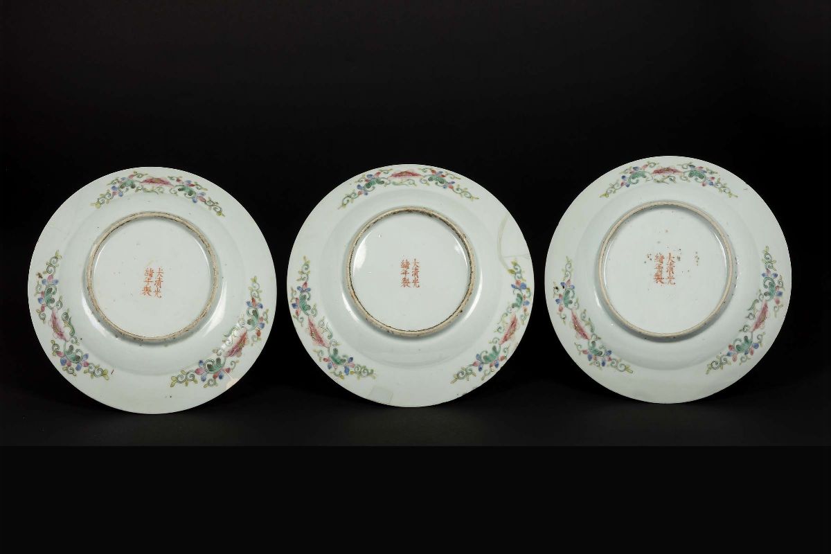 Tre piatti in porcellana a smalti policromi a fondo giallo con iscrizioni entro riserve, Cina, Dinastia Qing, marchio e del periodo Guangxu (1875-1908)