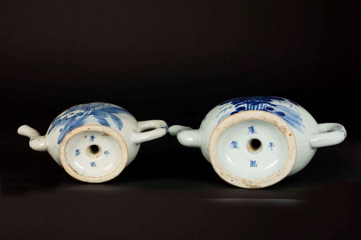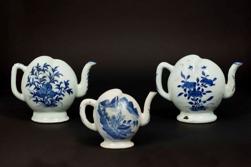 Tre wine pots in porcellana bianca e blu con motivi vegetali e naturalistici, Cina, Dinastia Qing, XIX secolo