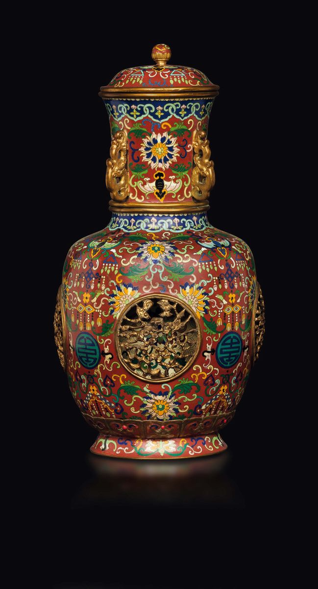 Vaso cloisonné con coperchio a doppia parete, Cina, Dinastia Qing, fine XIX secolo