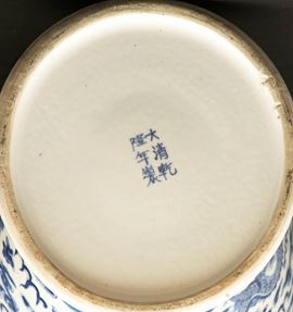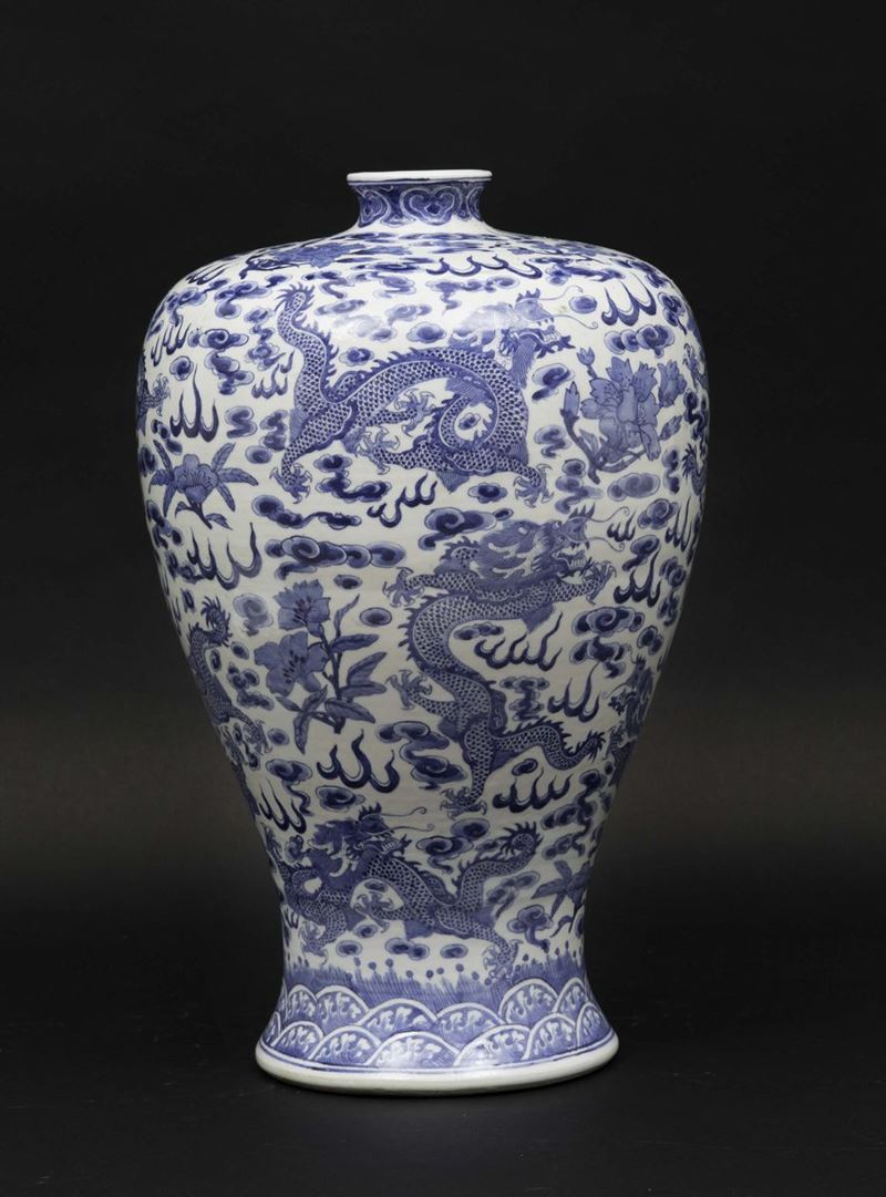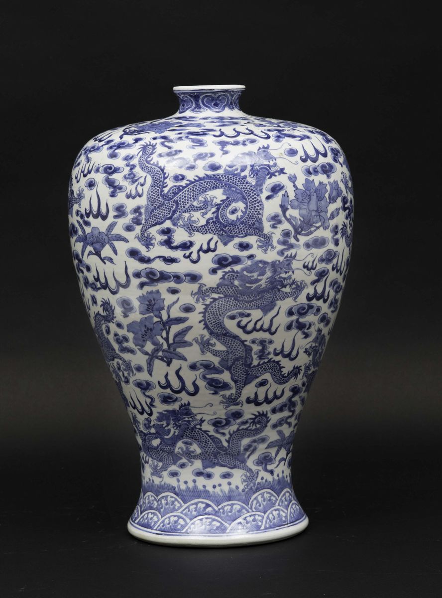 Vaso in porcella bianca e blu con draghi tra le nuvole, Cina, XX secolo