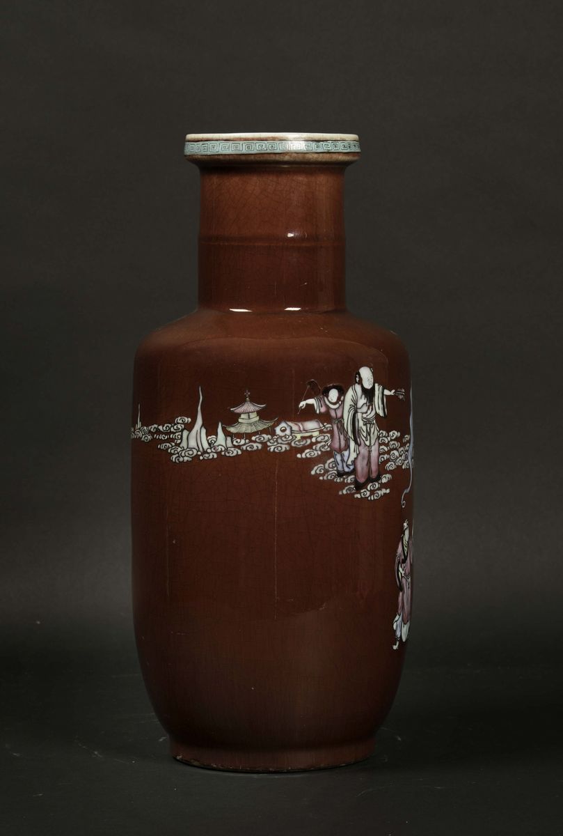 Vaso in porcellana sangue di bue a smalti policromi con raffigurazioni di saggi, Cina, Dinastia Qing, XIX secolo