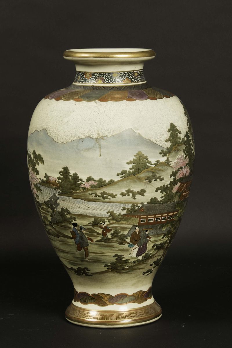 Vaso in terraglia Satsuma raffigurante pagode e figure, Giappone, epoca Meiji, fine XIX secolo