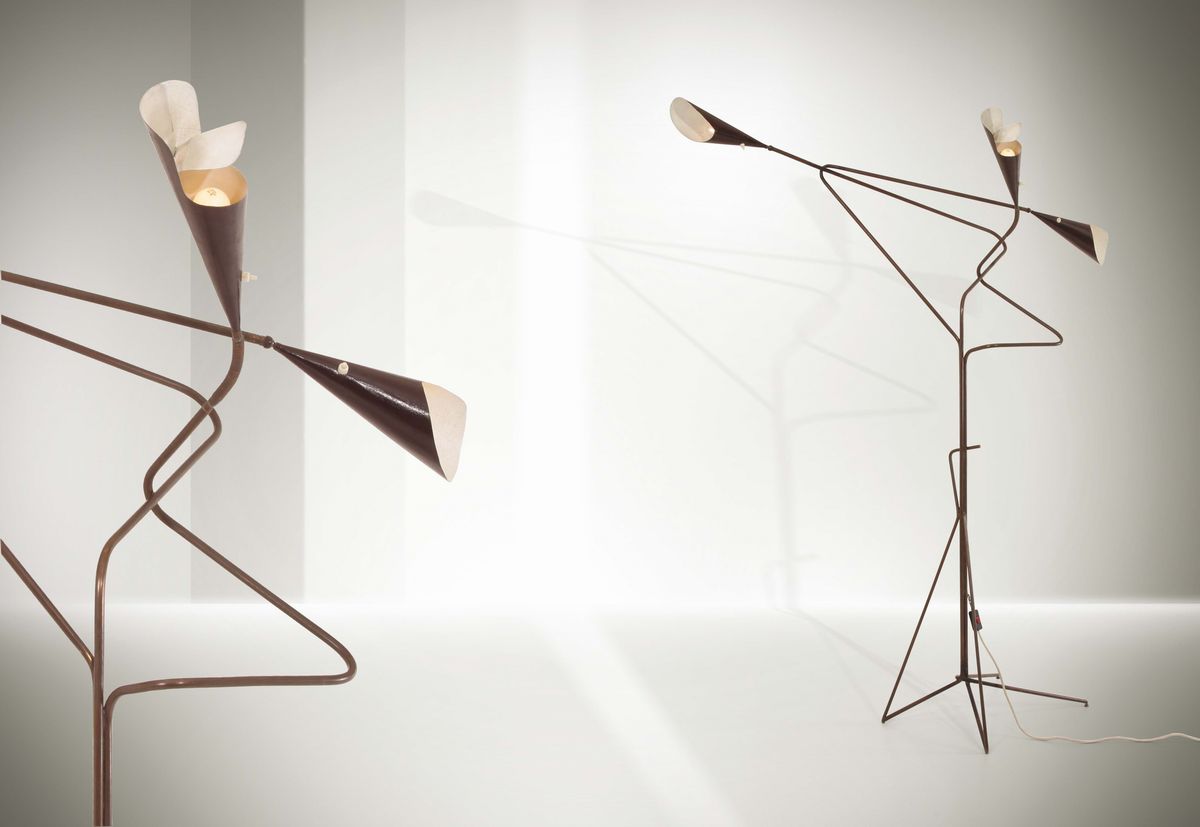 Lampada a tre luci con struttura in ottone e diffusori in alluminio laccato.