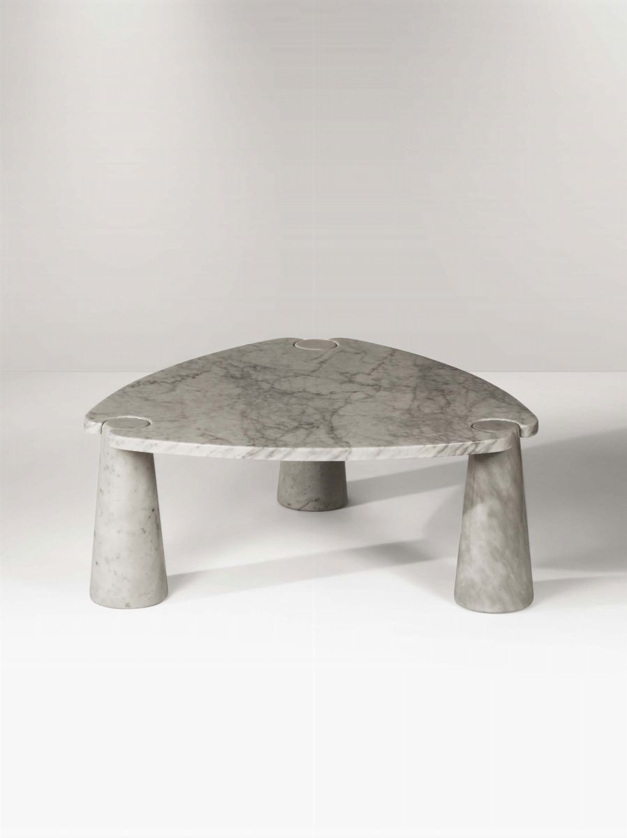 Tavolo basso Eros in marmo bianco con piano ad incastro a secco su tre elementi troncoconici.