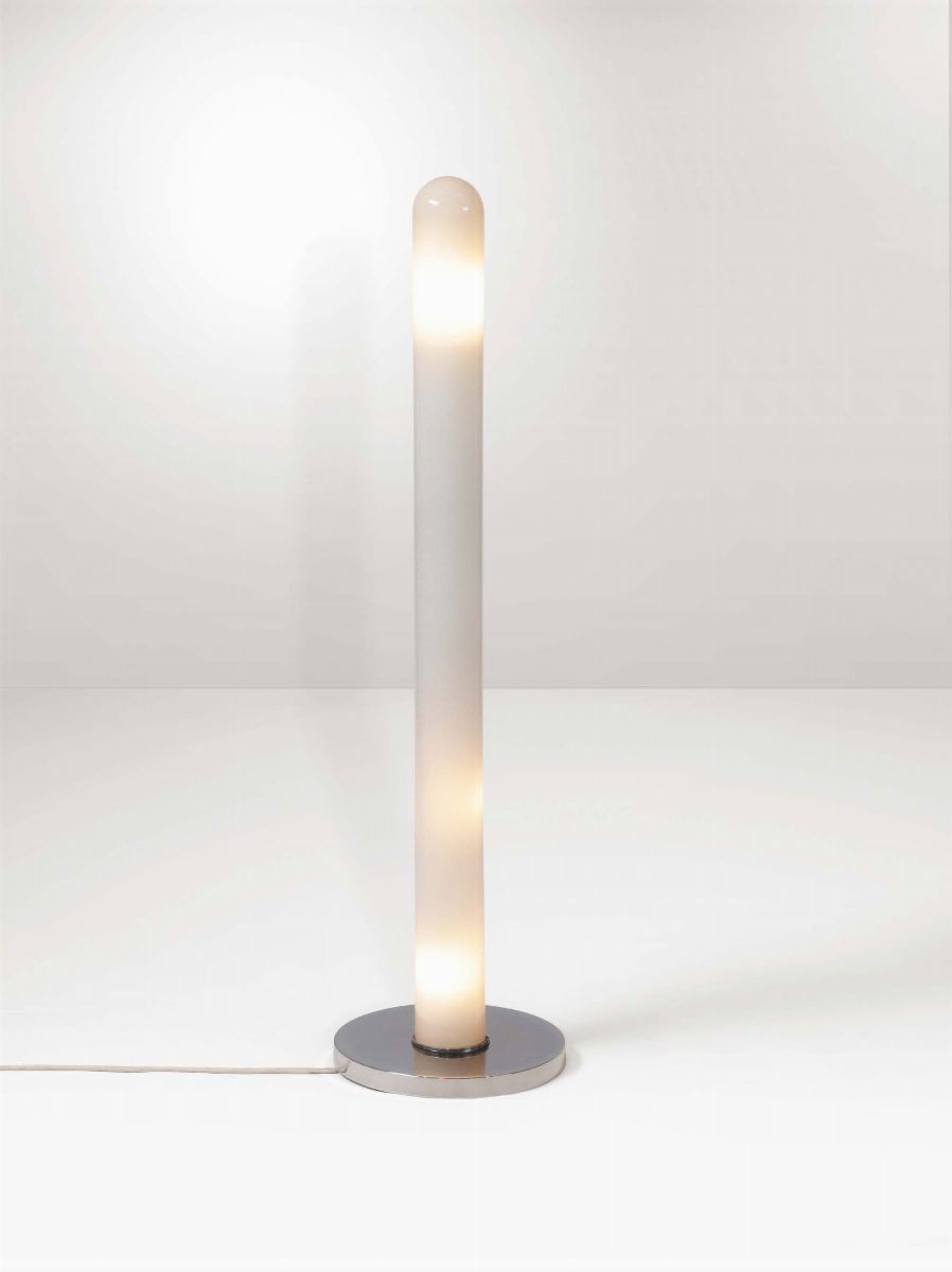 Lampada da terra con base in ottone cromato e diffusore in vetro di Murano a bollicine.