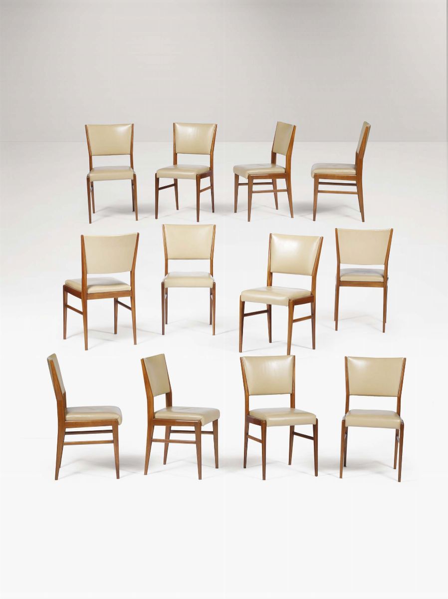 Dodici sedie con struttura in legno e rivestimenti in skai.
