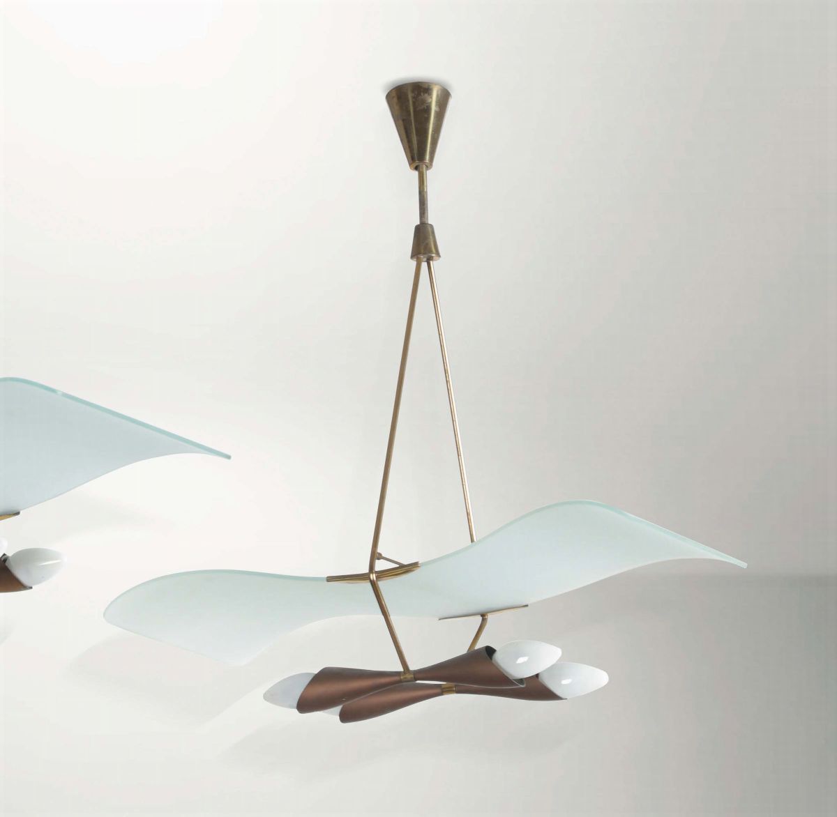 Lampada a sospensione con struttura in ottone e diffusore in vetro curvato molato e sabbiato. Decalcomania originale.
