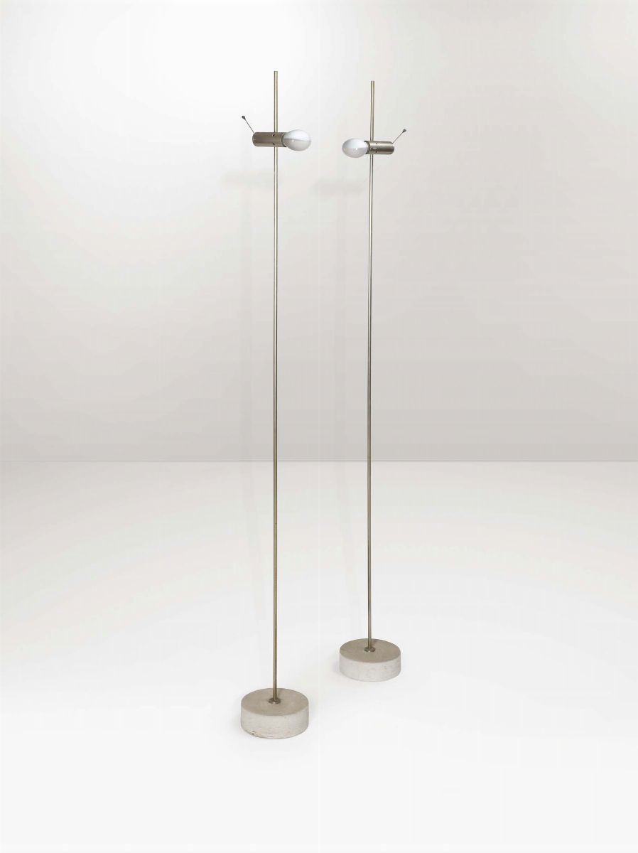 Coppia di lampade da terra mod. 387 con base in travertino e struttura in ottone cromato.