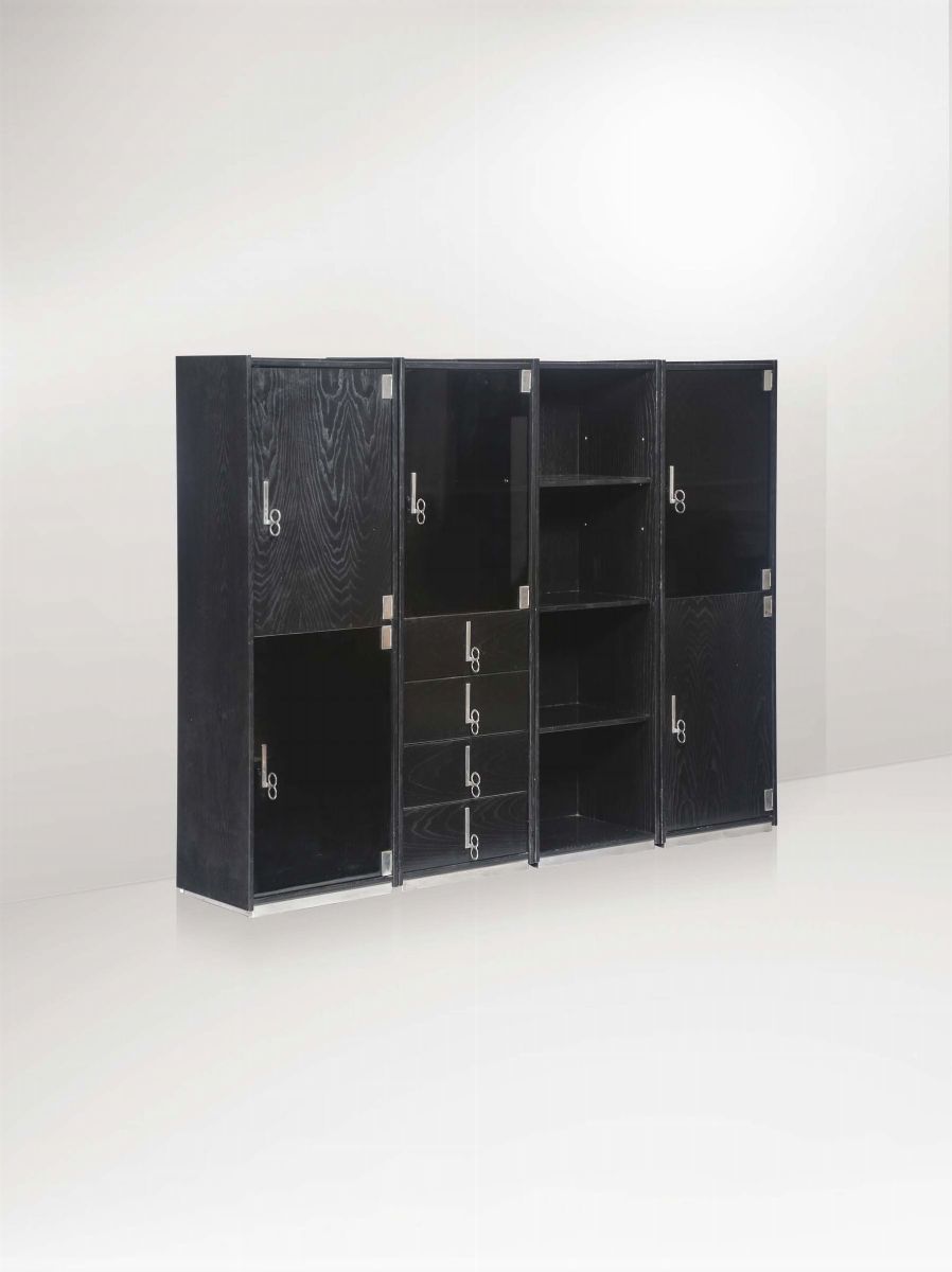 Libreria modulare con struttura in legno laminato, elementi in vetro e dettagli in ottone nichelato.