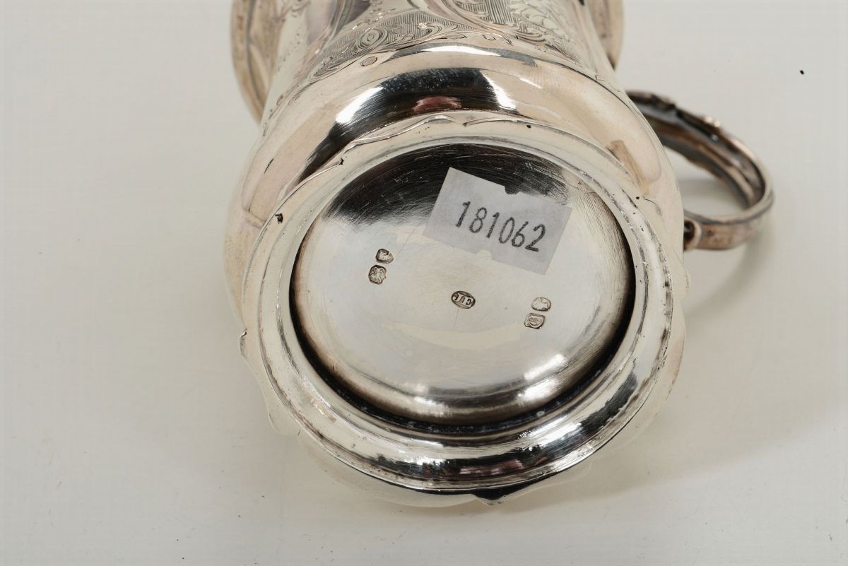 Boccale in argento fuso, sbalzato e cesellato con motivi floreali e riserve ovali. Londra 1855, argentiere JE