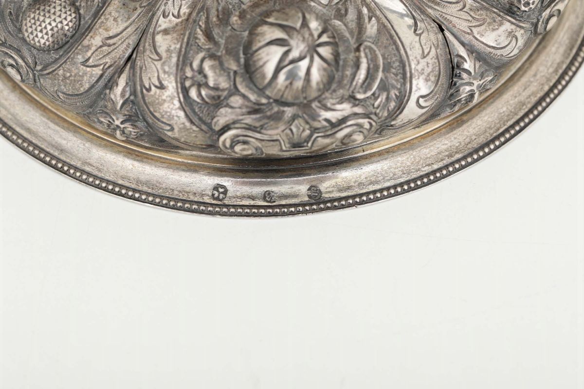 Candeliere a due bracci in argento fuso, sbalzato e cesellato. Impero austro-ungarico (?), fine XIX secolo
