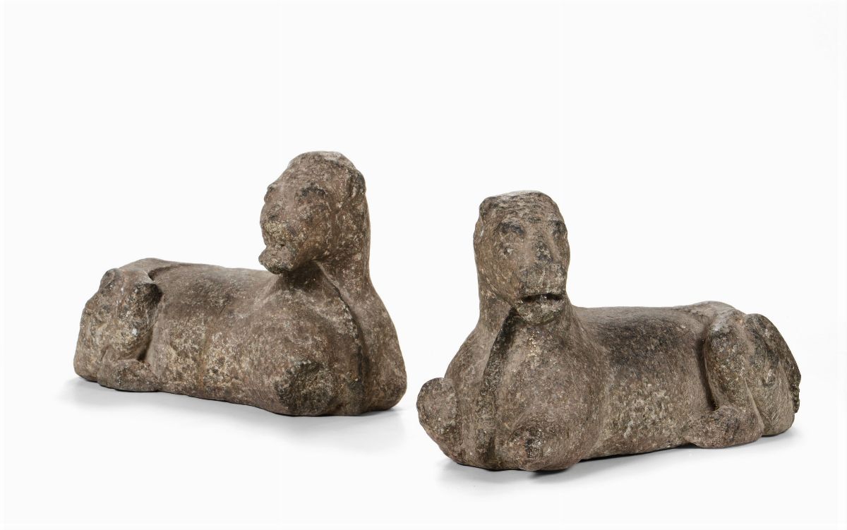 Coppia di leoni in pietra scolpita, probabile XIV secolo