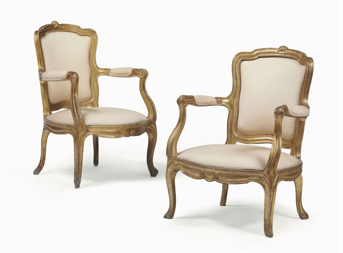 Coppia di poltrone di gusto Luigi XV in legno intagliato e dorato, Francia, XIX secolo