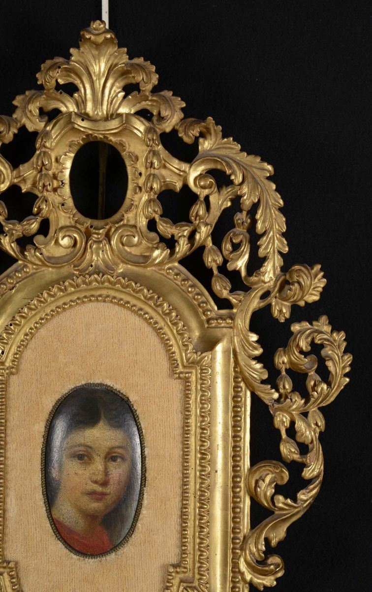 decori a motivi vegetali, cartigli e volute, al centro piccolo dipinto a olio con volto di bambina non pertinente e di epoca posteriore, cm 45x30