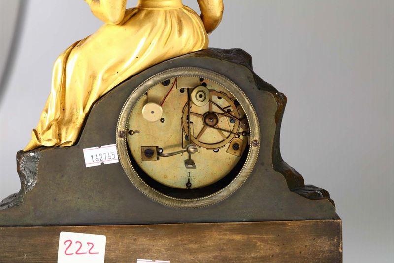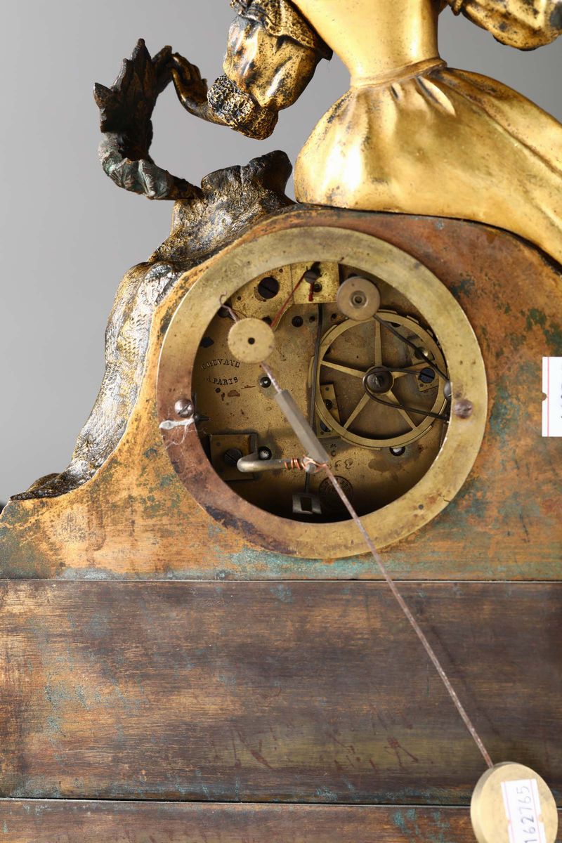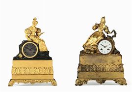Due pendole Carlo X in bronzo dorato e brunito con figura maschile e figura femminile, XIX secolo