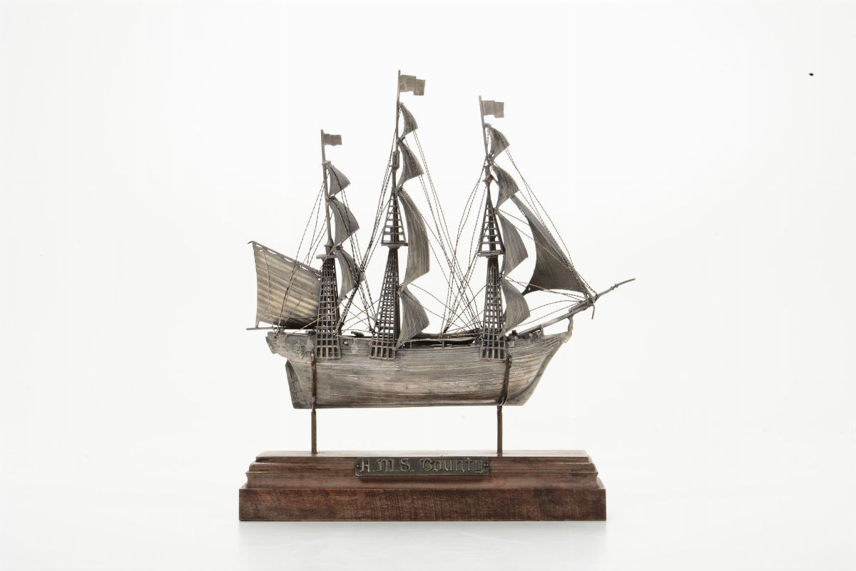 Modellino del veliero H.M.S. Bounty in argento fuso, Italia XX secolo
