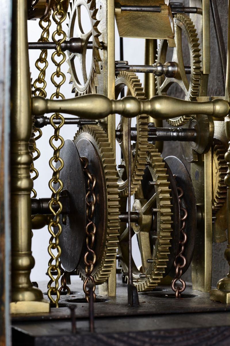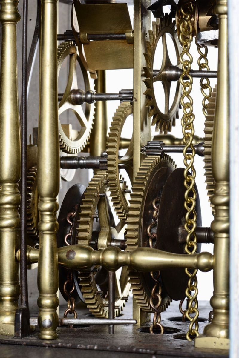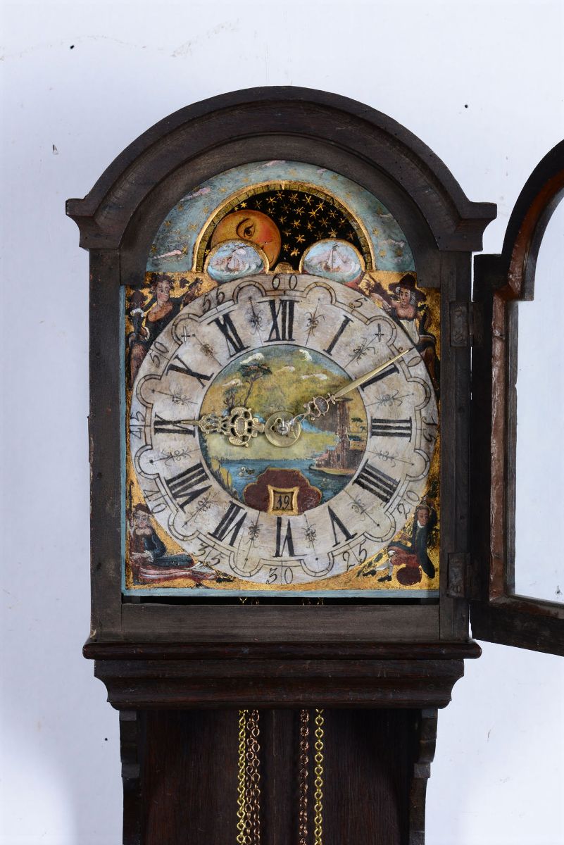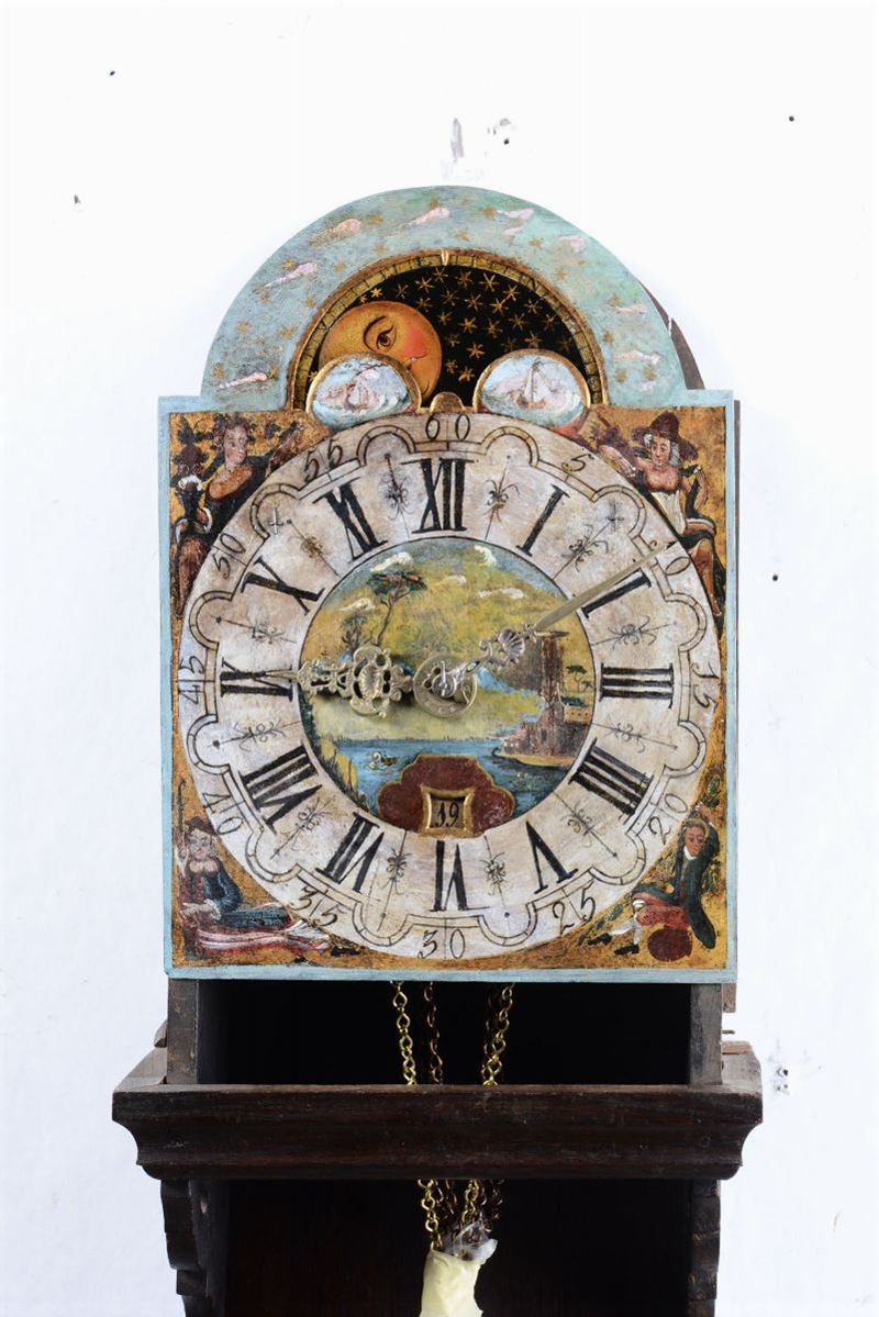 cassa in legno di rovere, quadrante in lamiera dipinta con data e fasi lunari, meccanica e ancora con suoneria delle ore e delle mezzore, modello piccolo. cm 93x36x21