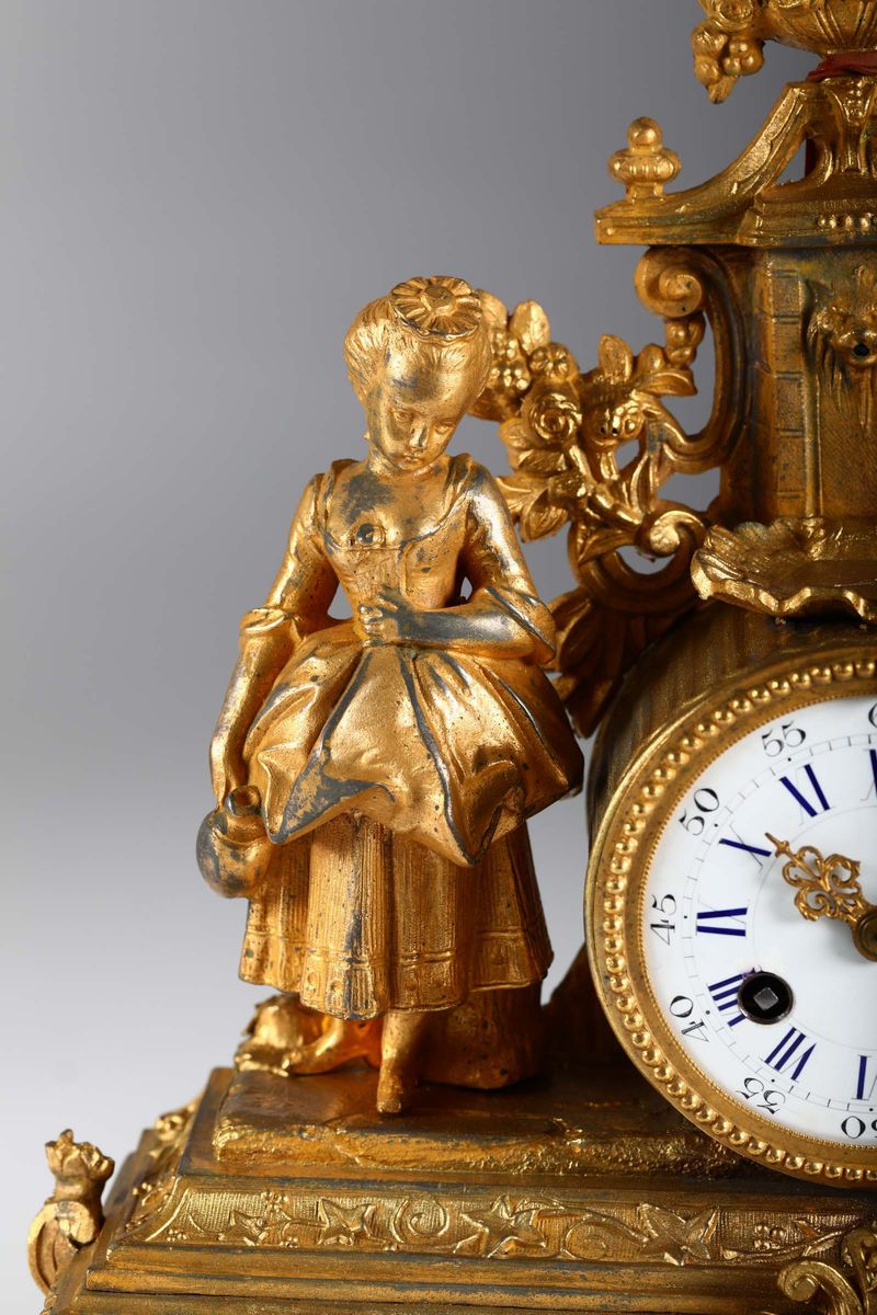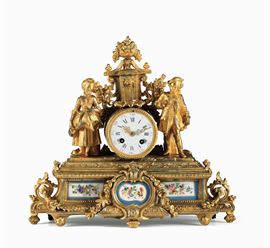 Pendola da camino in metallo dorato con inserti in porcellana dipinta, XIX secolo