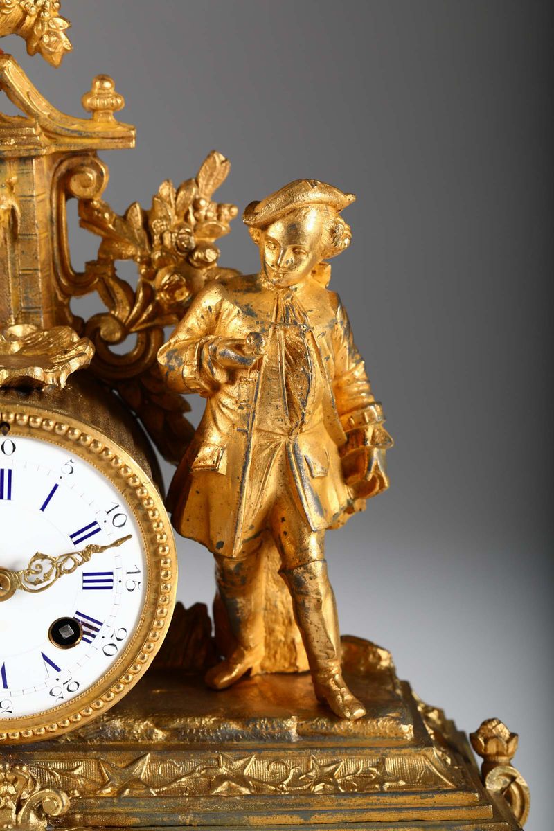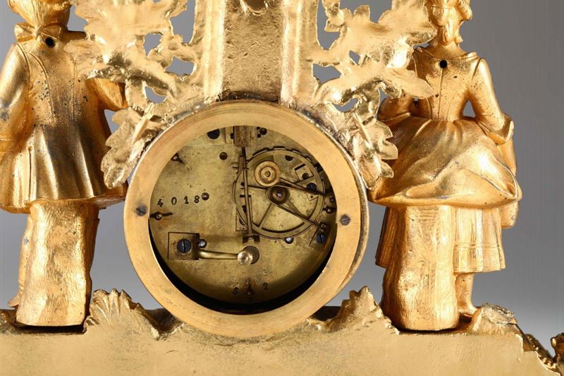 Quadrante in smalto bianco a numerazione romana ed araba affiancati da figura maschile e figura femminile e sormontato da fontana. Base con applicazioni di placche in porcellana policroma a decori floreali. Meccanica con sospensione a lamella e scappamento ad ancora, suoneria a ore e mezze al passaggio.