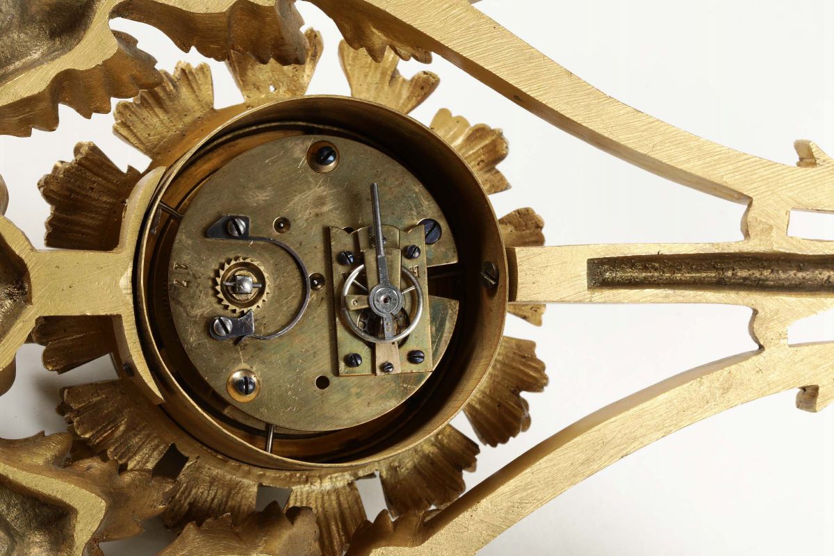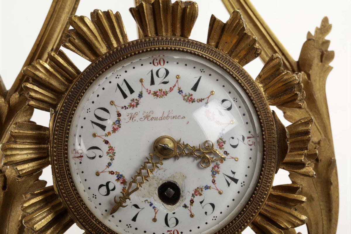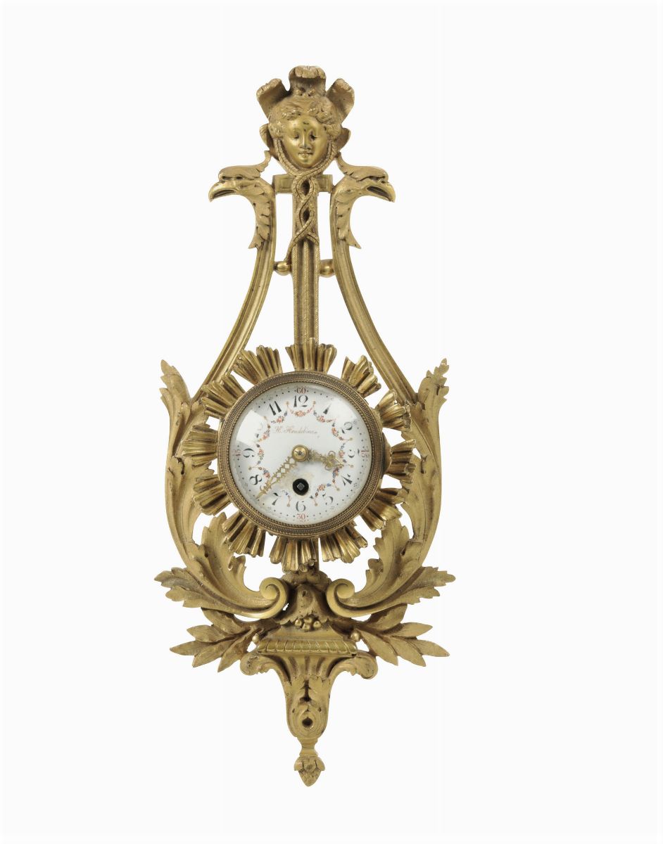 Pendola da parete a lira in bronzo dorato, H. Houdebines, Francia XIX secolo