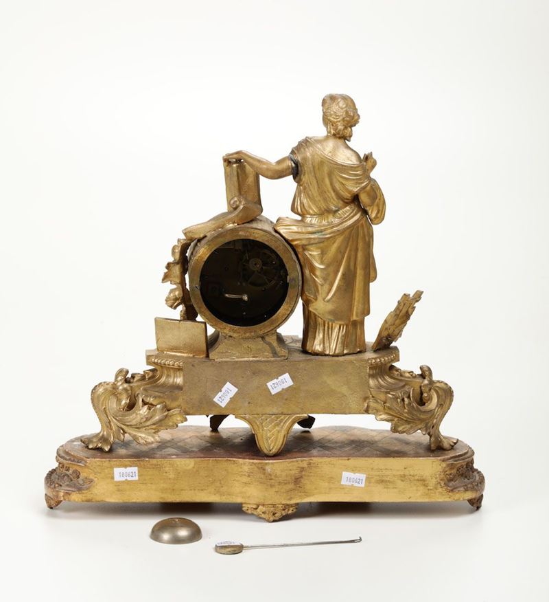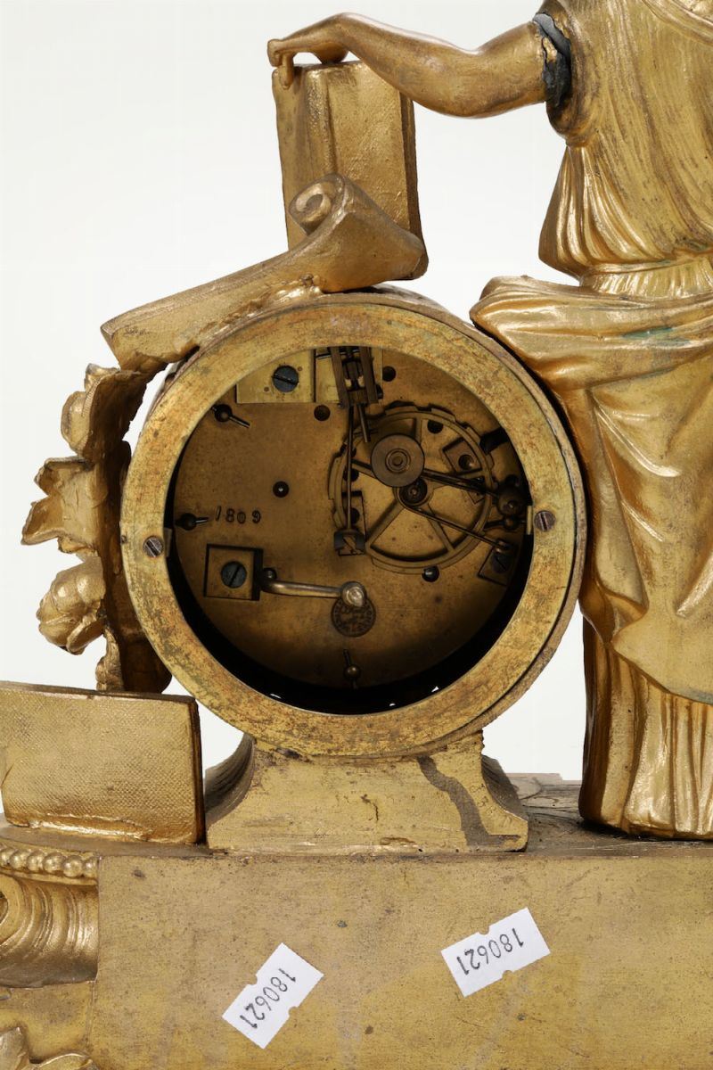 quadrante smaltato a numerazione romana in nero affiancato da figura femminile con libro a tuttotondo, cm 37x11x33