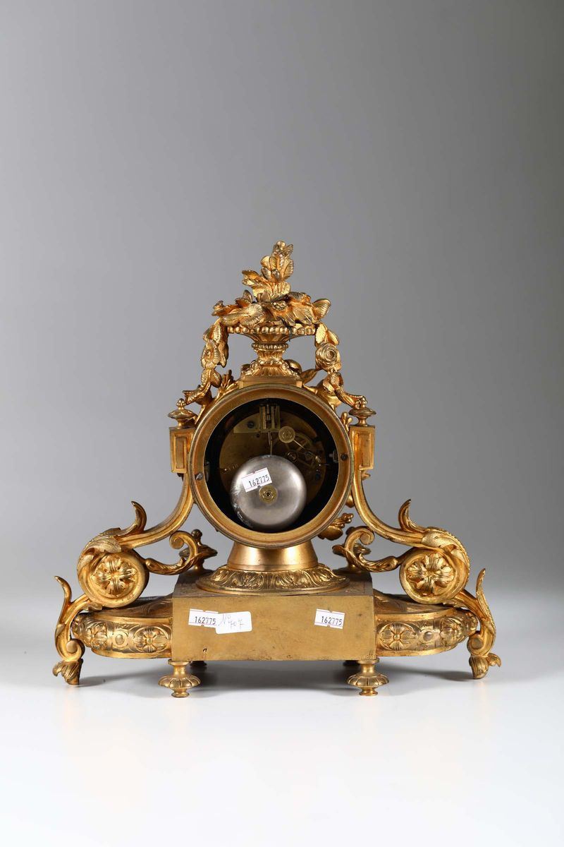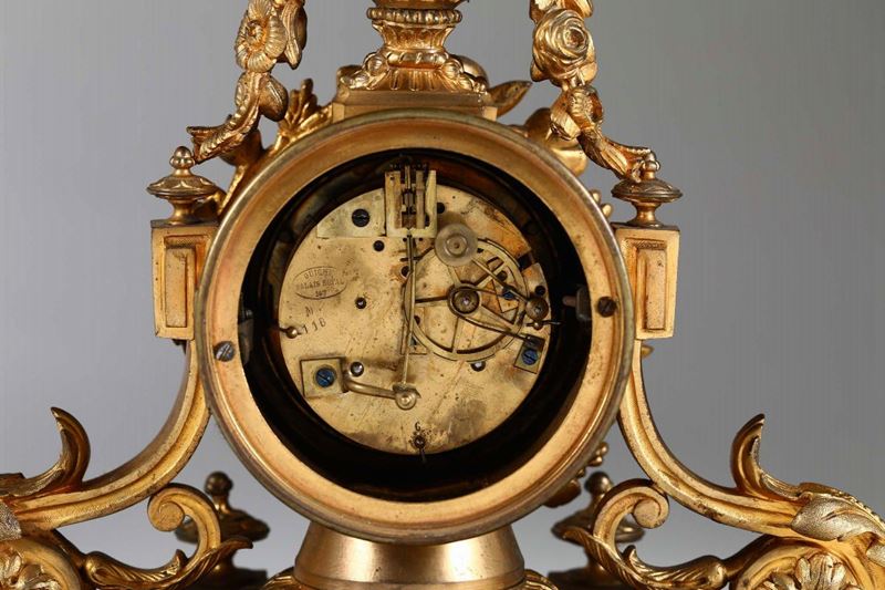 Cassa in bronzo dorato con decori a volute, festoni floreali, sormontata da vaso biansato bacellato. Quadrante in smalto bianco con numerazione romana per le ore e araba per i minuti . Movimento firmato Guiche Palais Royal 147, sospensione a lamella e scappamento ad ancora, suoneria a ore e mezze al passaggio.