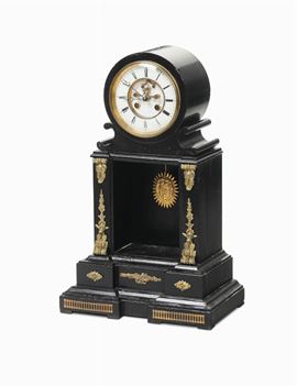 Cassa sagomata con applicazioni di bronzi dorati, quadrante smaltato a numerazione romana in nero per le ore, cm 28x17x46