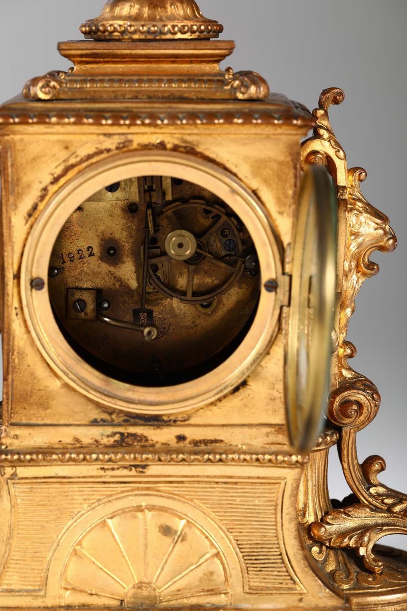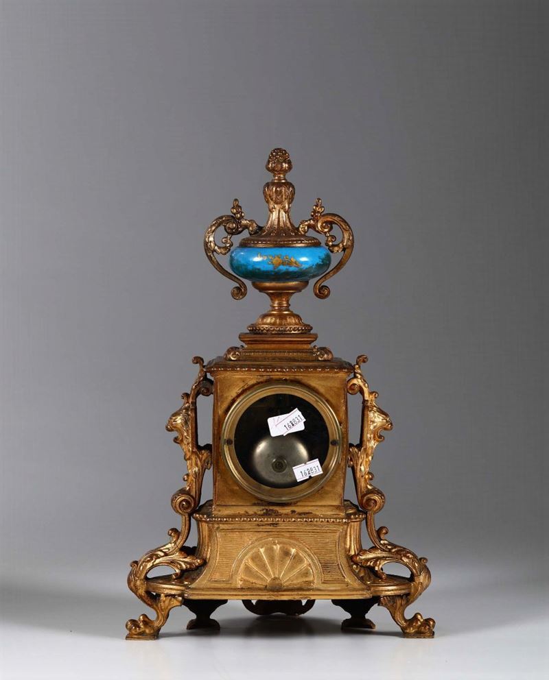Pendola da tavolo in metallo dorato con inserti in porcellana dipinta, fine XIX secolo