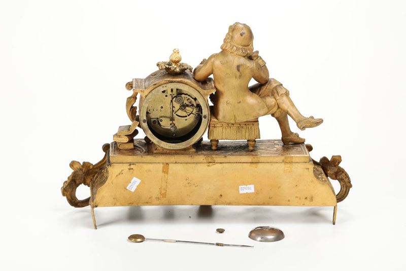 quadrante smaltato a numerazione romana in nero per le ore affiancato da figura maschile seduta, cm 45x14x30