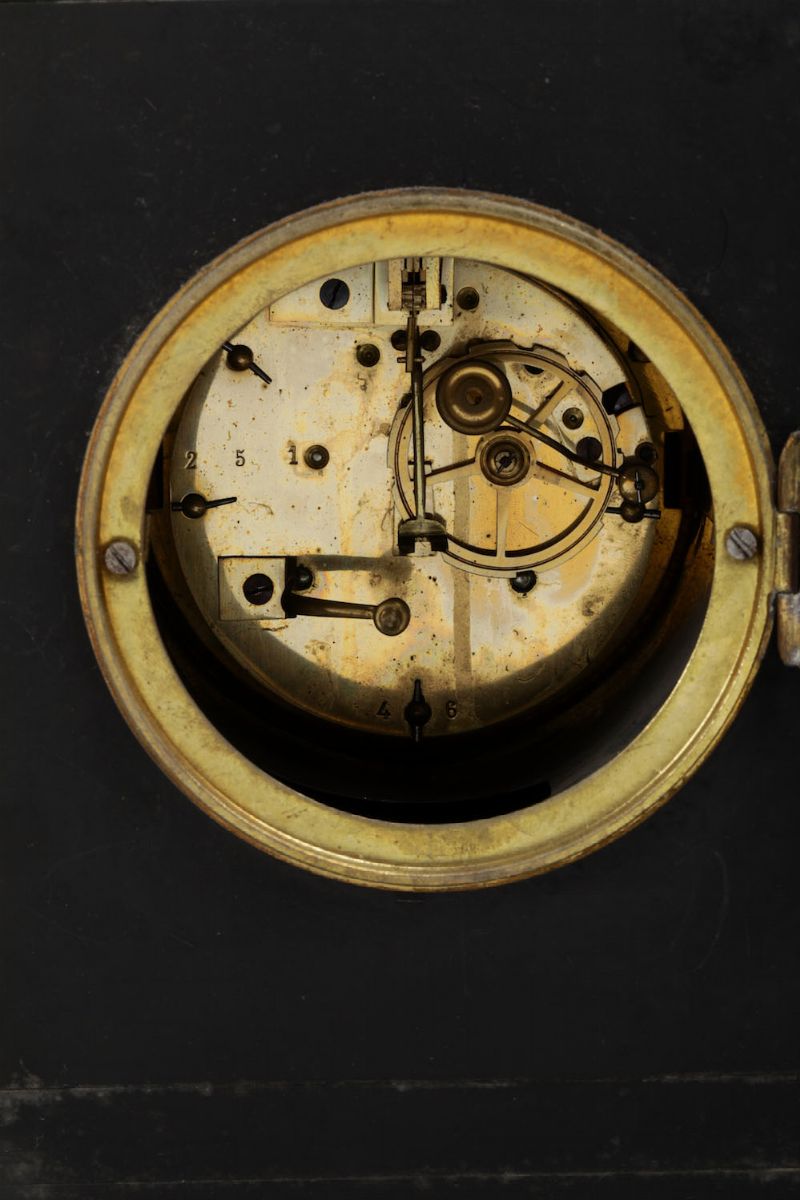 Pendola da tavolo in onice e marmo nero, prima metà XX secolo