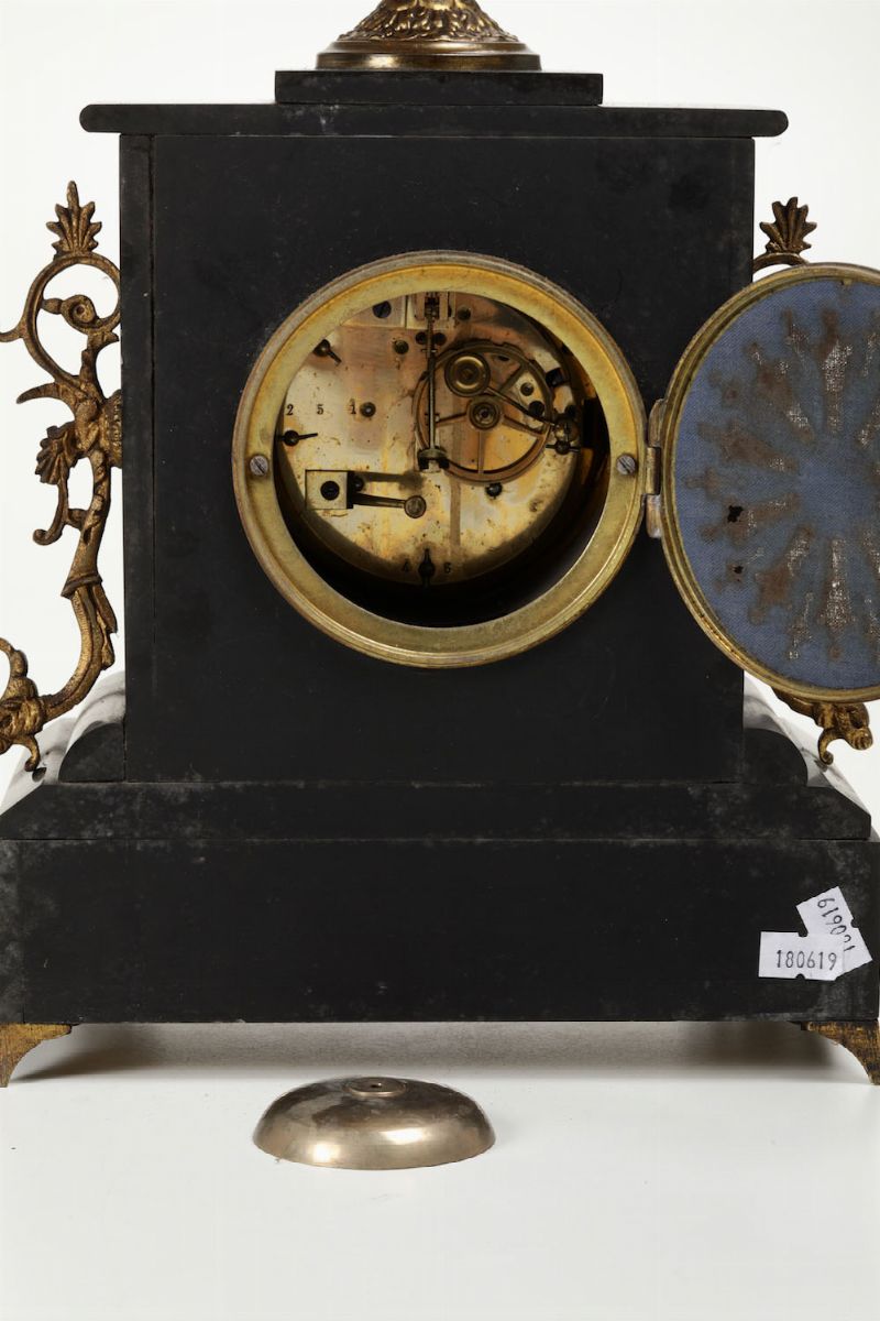 applicazioni di metalli dorati, quadrante a numerazione araba per le ore sormontato da vaso biansato. cm 26x15x42