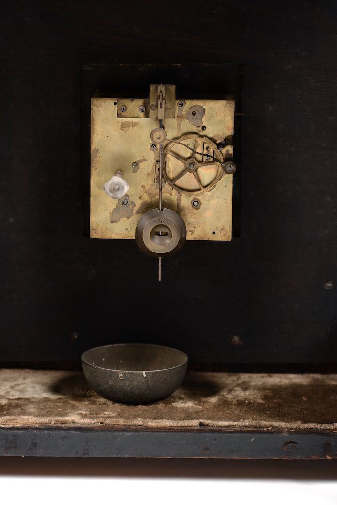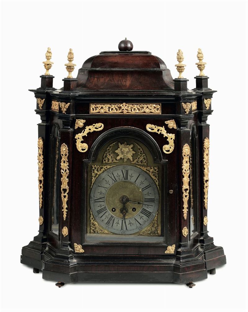 Riporti e guarnizioni in bronzo cesellato e dorato, fascia oraria argentata con numerazione romana per le ore ed araba per la minuteria, cm 54x21x68 (difetti)