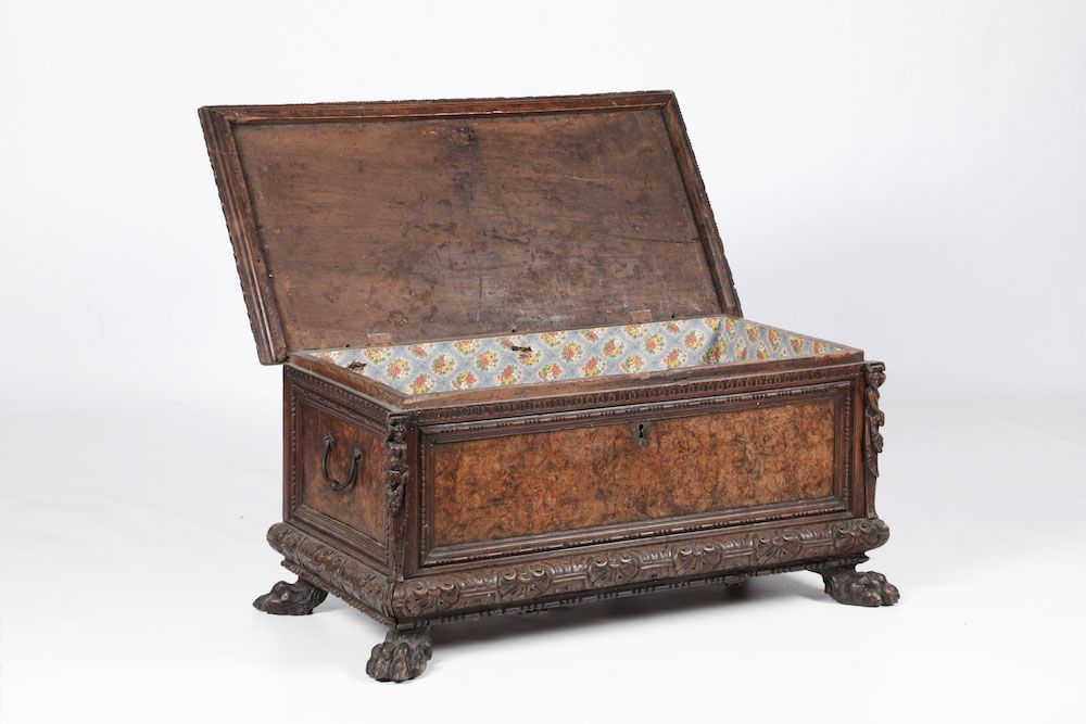 Piccola cassapanca in noce intagliato, Nord Italia XVII secolo