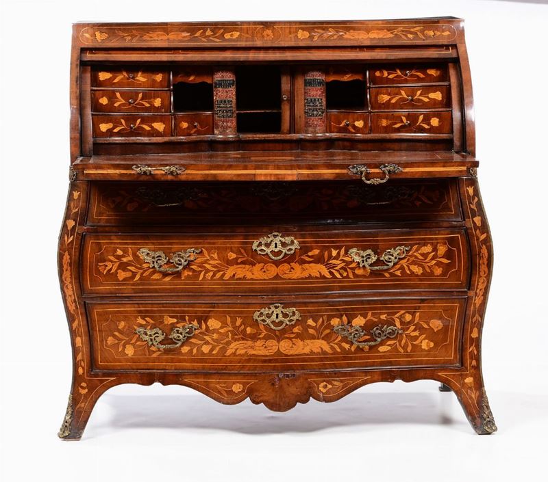 decori intarsiati a motivi ornamentali floreali; fronte e fianchi mossi, tre cassetti sotto lo scrittoio estraibile a rullo con interno suddiviso in cassettini e vani porta documenti, cm 112x59x114