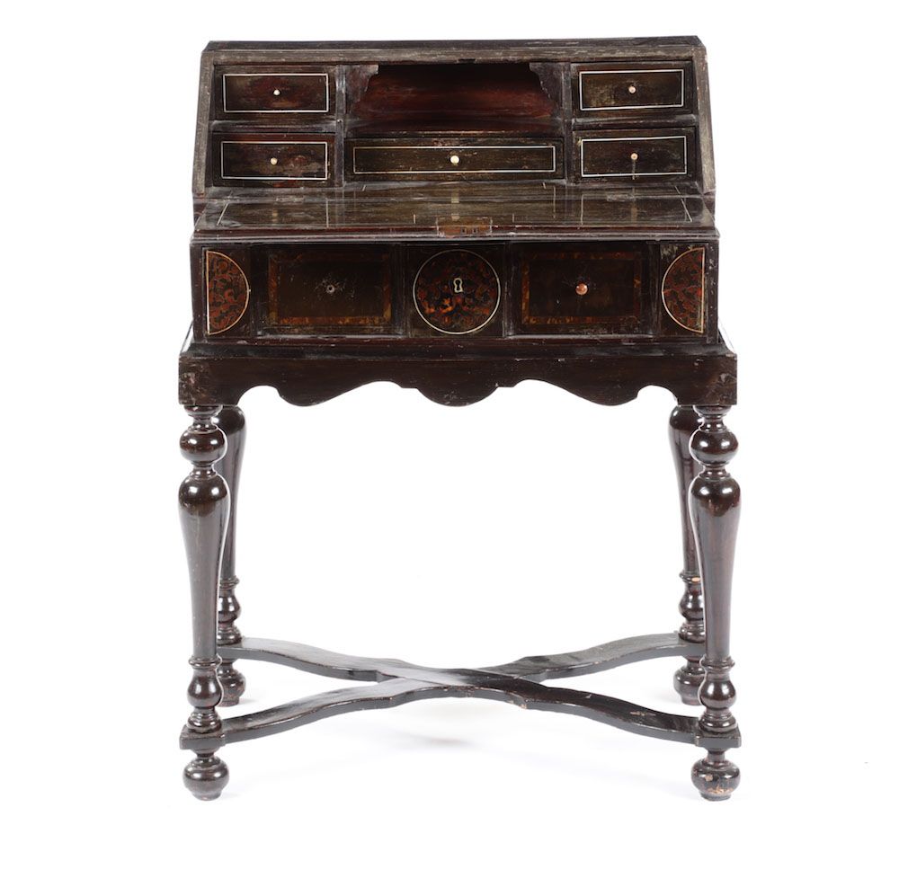 un cassetto sotto la calatoia celante cinque cassettini e vano a giorno, base con montanti torniti riuniti da crociera, cm 73x42x99