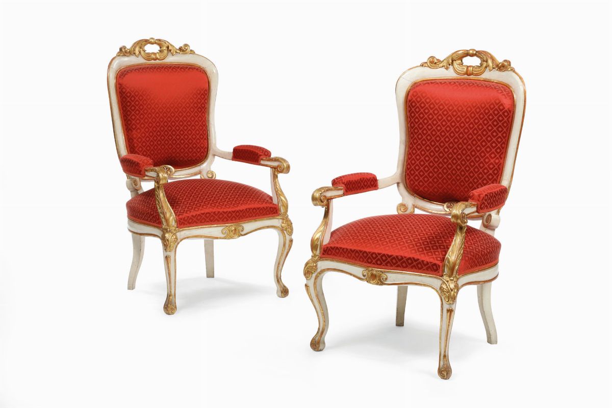 Salotto composto da divano e due poltrone in legno intagliato, laccato e dorato, XIX secolo