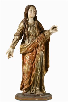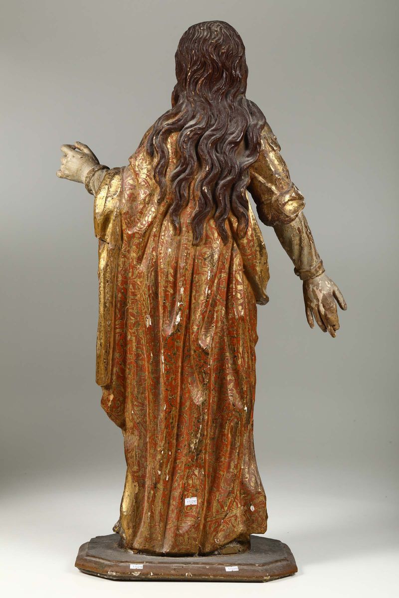 La bella scultura, probabilmente una Maria Maddalena, si contraddistingue per la finezza dell’intaglio e per la qualità della doratura: la scultura potrebbe ben inserirsi nel filone di scultori di cultura spagnola che affollarono la capitale del viceregno nella seconda metà del XV secolo e in quello successivo, continuando a portare avanti gli insegnamenti di Pietro e Giovanni Alemanno.