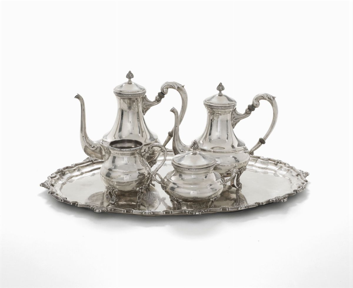 composto da teiera, caffettiera, zuccheriera, lattiera e vassoio sagomato, gr. 4120