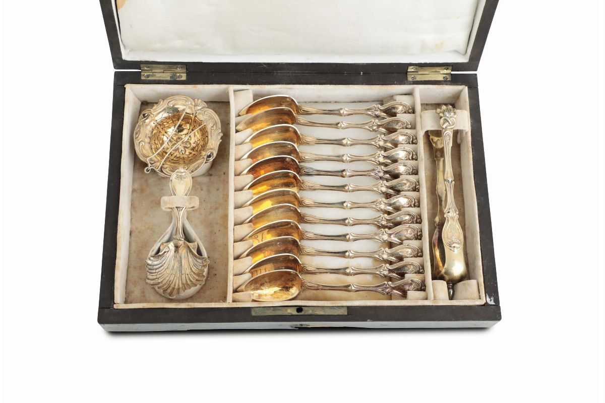 composto da dodici cucchiaini, pinza e cucchiaio per lo zucchero e colino, gr 215; cm cucchiaini 13; pinze cm 14,5; infusore cm 6;